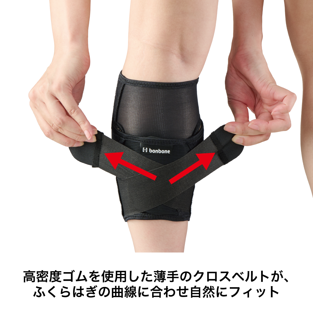 ・高密度ゴムを使用した薄手のクロスベルトが、ふくらはぎの曲線に自然にフィット。
