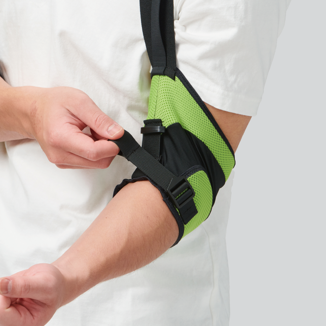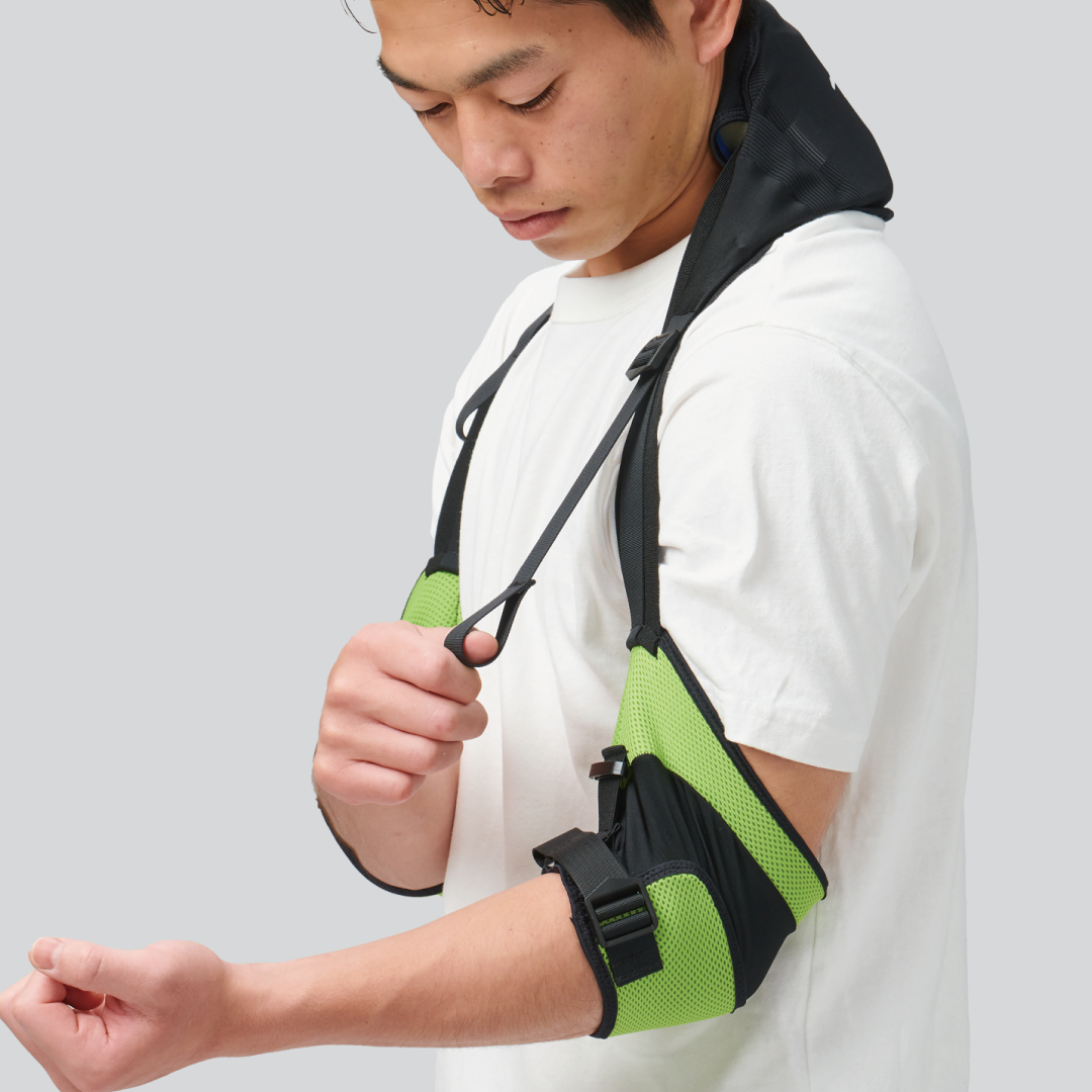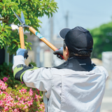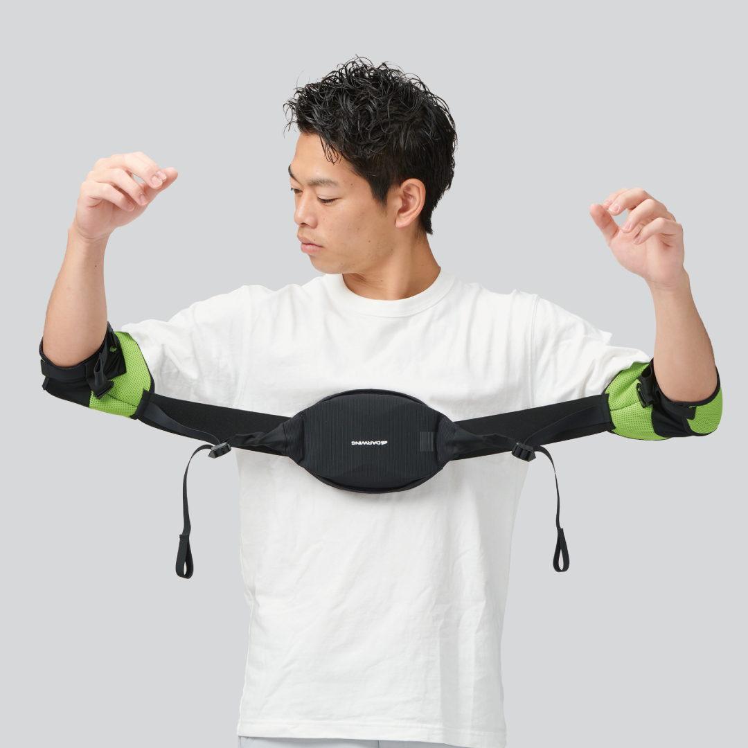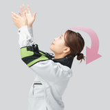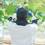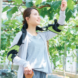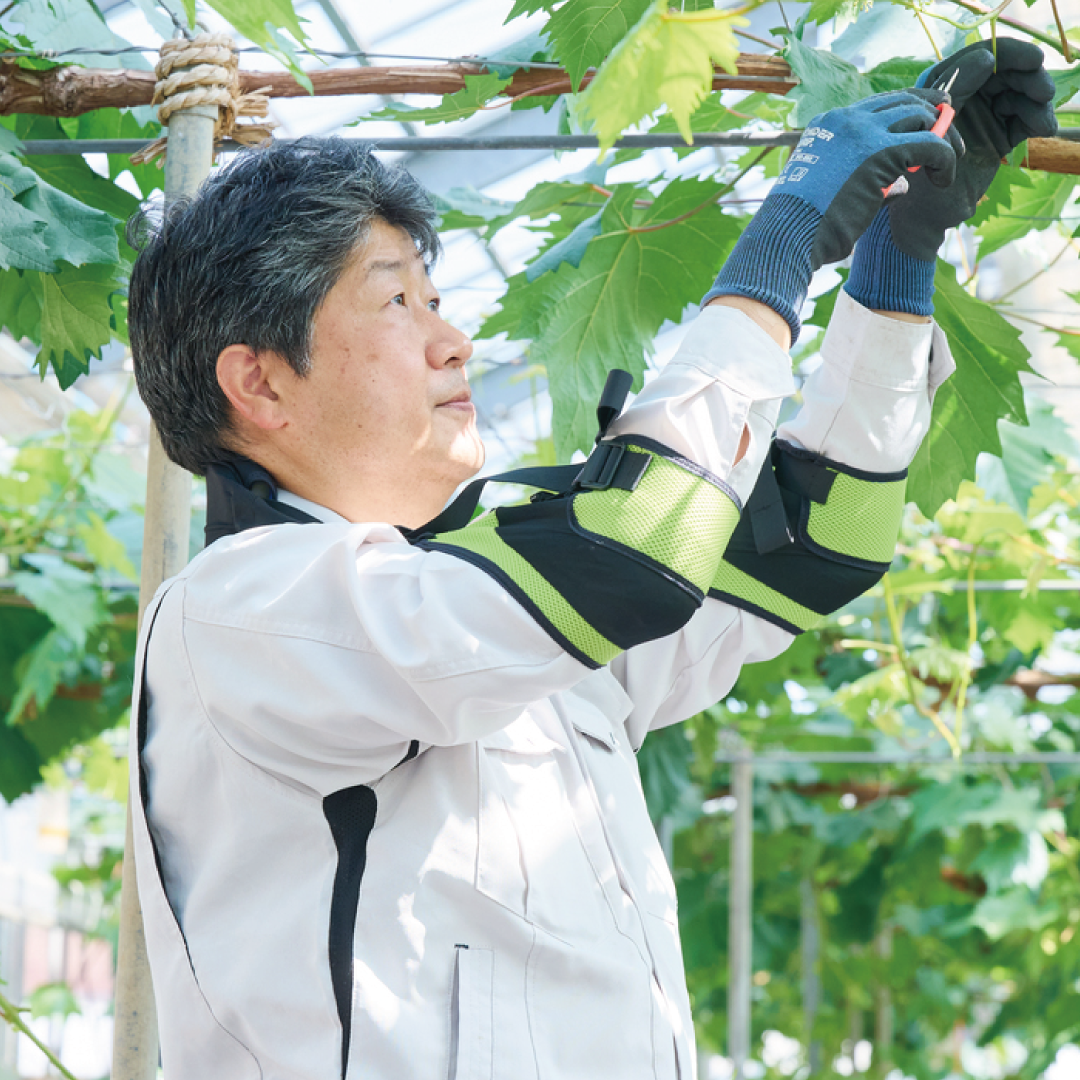 果樹農家さまの悩みの種である、長時間の腕上げ作業に伴う、腕・首・肩の負担軽減を目的としたアシストスーツです。