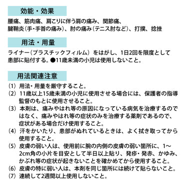 ライナー(プラスチックフィルム)をはがし,1日2回を限度として患部に貼付する。