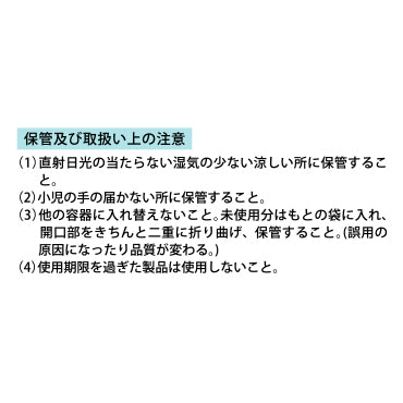 (3)他の容器に入れ替えないこと。未使用分はもとの袋に入れ,開口部をきちんと二重に折り曲げ,保管すること。(誤用の原因になったり品質が変わる。)
