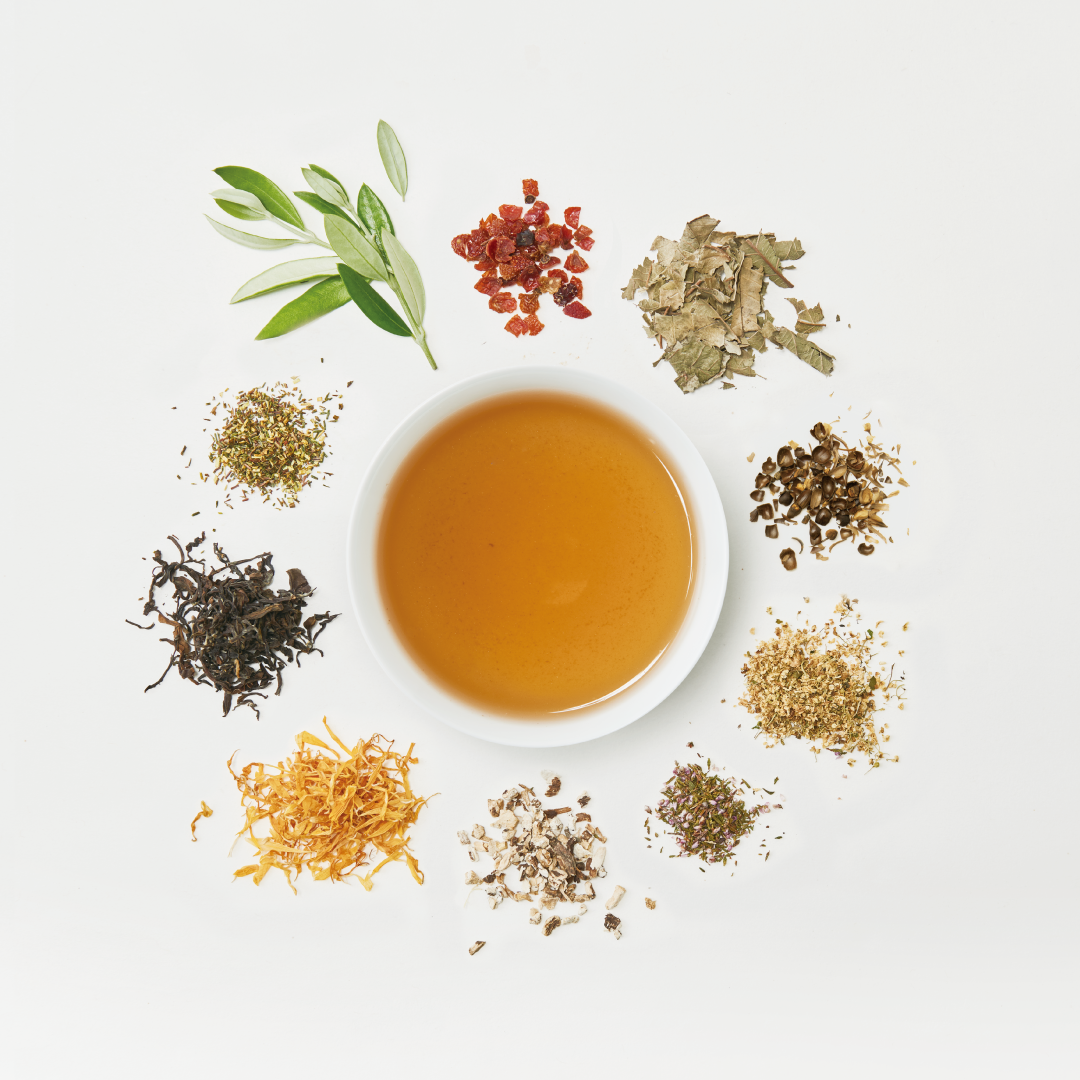 烏龍茶(台湾産)、ルイボスグリーン、ハトムギ、オリーブ、ローズヒップ、レッドグレープリーフ、グァバ葉、ネトル、バードックルート、ダンデリオンルート、ジュニパーベリー、マリーゴールド、ヒース、ローズマリー、エルダーフラワー、月見草