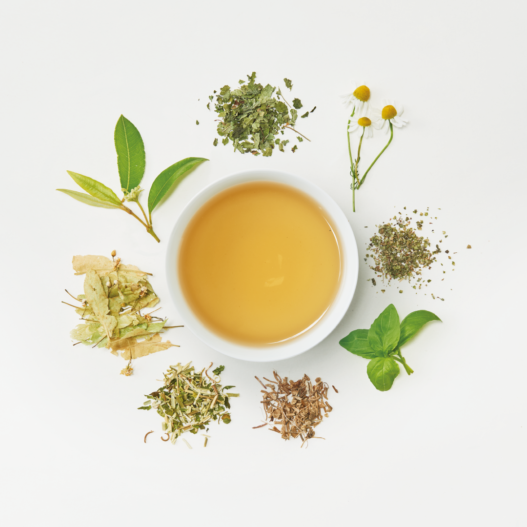 カモマイルジャーマン(エジプト産)、レモンバーム、レモンマートル、リンデンフラワー、モリンガ、パッションフラワー、マジョラム、バジル、バレリアン、アグリモニー