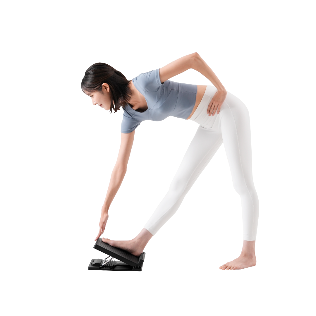 ●下半身後面の筋肉をしっかりストレッチ ボードの上に乗ってストレッチを行うことで、硬くなったふくらはぎや太ももをほぐします。
