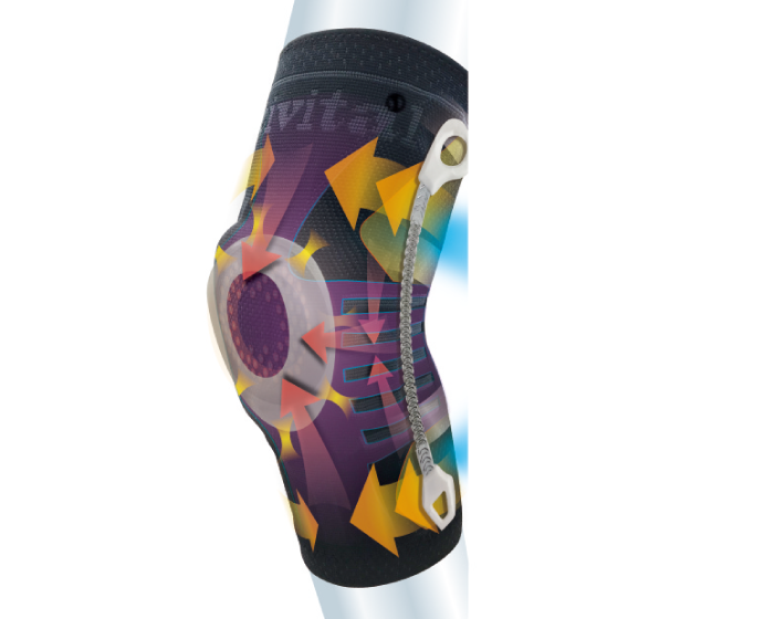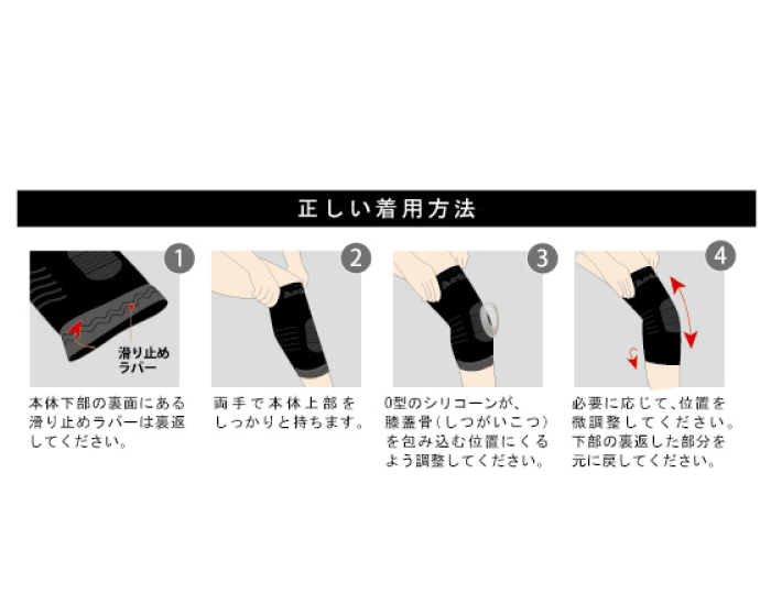 O型シリコーンリングは、膝蓋骨周辺を包み込むことで膝蓋骨をサポートし、圧力分散により関節の負担を軽減します。