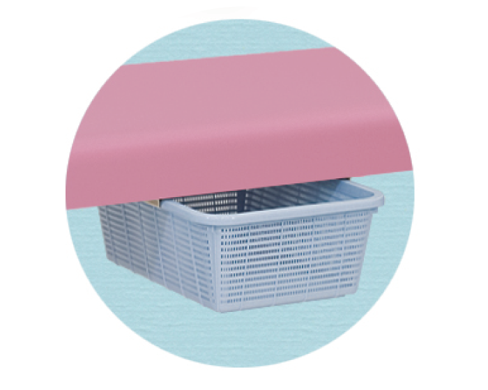患者様の私物や小物類の収納に便利な引出式の脱衣カゴを標準装備。